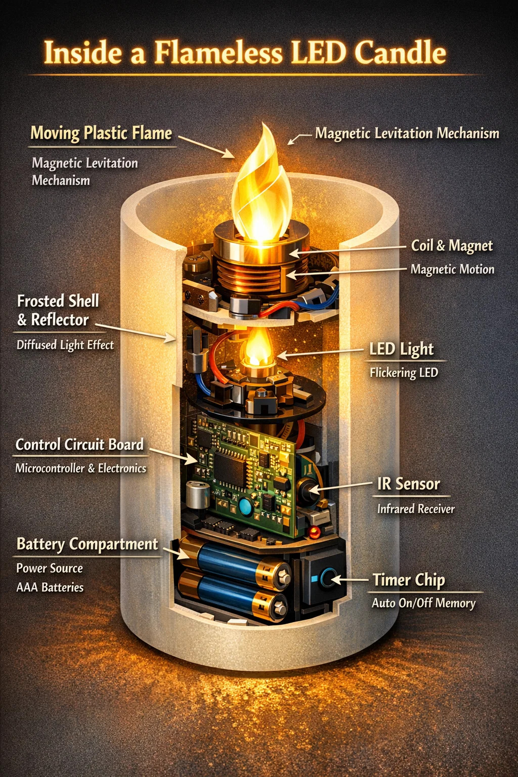 Cada vela LED sin llama suele tener un compartimento para pilas en su base. Cuando enciendes el interruptor, la energía de la batería activa una placa de circuito de control en miniatura en el interior. Esta placa de circuito actúa como el "cerebro" de la vela y controla cuándo se enciende la luz y cómo cambia su brillo.