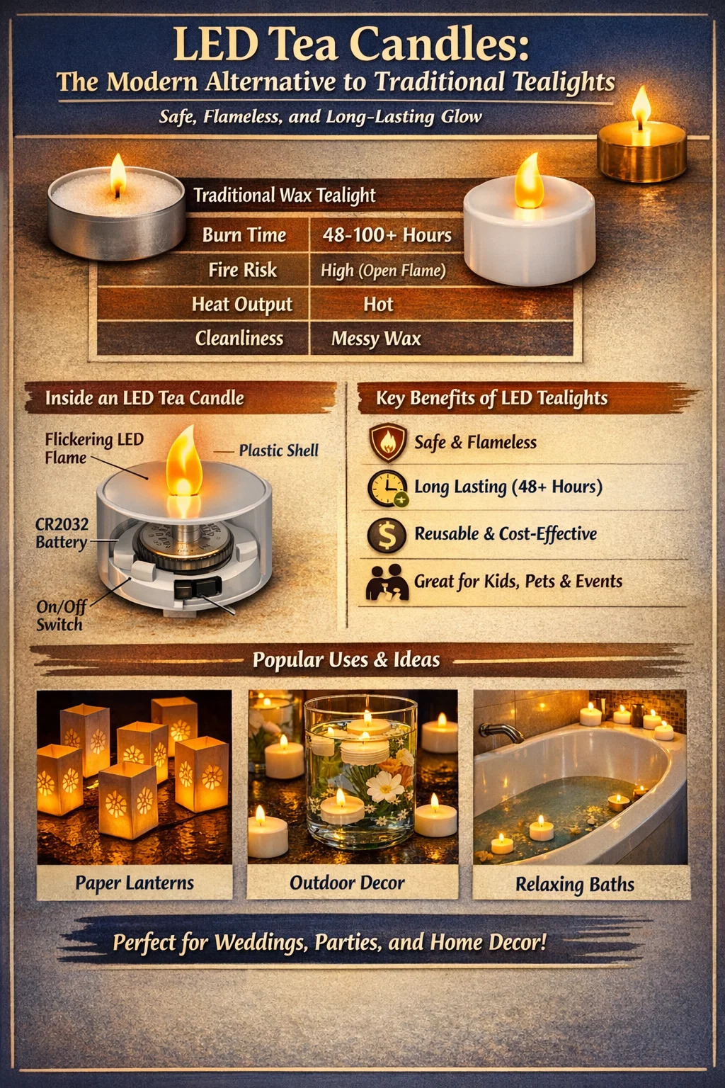Ya sea que esté planeando una gran recepción de boda o simplemente desee un baño relajante sin preocuparse por el riesgo de incendio, vela de té LEDs Proporcionar una solución limpia, confiable y hermosa para las necesidades de iluminación modernas.
